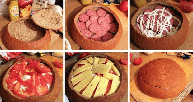 След като напълните изрязания хляб с любимите си месни деликатеси, сирена, зеленчуци и сосове, разрежете го на малки парчета – сандвичи. Снимка: diddlybop.ru